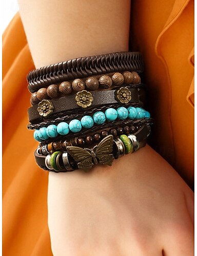 set di braccialetti da donna in pelle bohémien e perline di legno – ciondolo a farfalla vintage, multistrato turchese per casual, viaggi e festival estivi