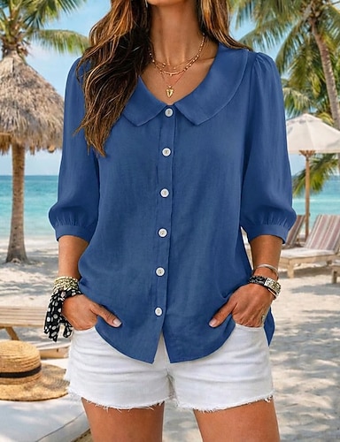 Per donna Blusa Finto cotone e lino Bottoni Tinta unica Essenziale Casual Manica Corta Colletto a Camicia Top Regolari Quotidiano Blu Bianco Albicocca Estate Primavera