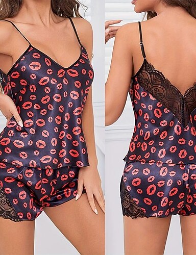 vestito da donna per San Valentino pigiama sexy set amanti della moda cuore comfort casa giorno di San Valentino quotidiano raso seta traspirante spalline senza maniche top con spalline pantaloncini