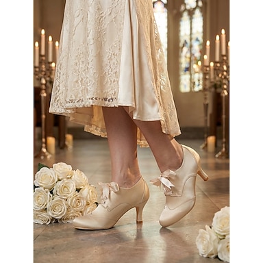 Scarpe con tacco da donna in raso color crema con lacci - eleganti décolleté Oxford vintage con fiocco in nastro per matrimoni in chiesa, per la madre della sposa e per occasioni formali