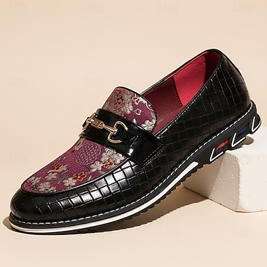 mocassini da uomo neri e rossi con stampa floreale, modello slip-on, con dettaglio in metallo effetto coccodrillo, calzature eleganti di lusso per matrimoni, banchetti, feste, balli di fine anno e occasioni serali di grande impatto.