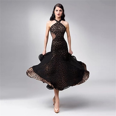 abito da ballo latino da donna con stampa leopardata, scollo all'americana, schiena scoperta, abito da competizione per tango e rumba, elegante gonna fluida – nero marrone