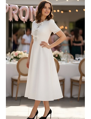 Linea ad A Lunghezza Tè Abito da Ballo Vestito da Festa Abito da Cocktail Abiti da sposa Abito da sposa Elegante Vintage Piccoli Abiti Bianchi Manica Corta Girocollo Formale Laurea Crepe Elasticizzato