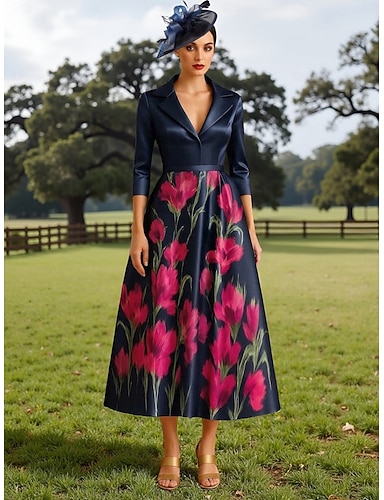 Linea ad A Lunghezza Tè Vestito da Festa Abito da Cocktail Abito da invitata a nozze Abito da cerimonia per signora Manica 3/4 Scollo a V Elegante Festa in giardino Matrimonio Formale Raso con Stampa