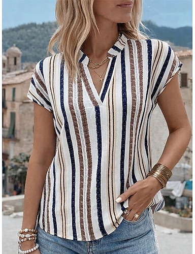 Per donna Maglietta Stampato A righe Moda Elegante Classico Manica Corta Scollo a V Top lunghi Quotidiano Uscire Weekend Rosso Cachi Estate Primavera
