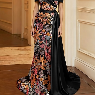 Sirena Tromba Lunghezza al pavimento Abito da Sera Abito formale Elegante Stile Celebrità Manica Lunga Scollo a Barca Festa in giardino Matrimonio con Stampa floreale Arricciato Spacco
