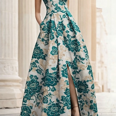 Linea ad A Lunghezza al pavimento Abito da Sera Da principessa Abito formale Elegante Spacco Alto Manica Corta Collo quadrato Matrimonio Formale Tasca Raso con Stampa floreale Spacco Tasca