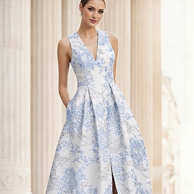 Linea ad A Lunghezza Tè Vestito da Festa Abito da Cocktail Abito da invitata a nozze Abito da cerimonia per signora Manica 3/4 Scollo a V Elegante Festa in giardino Matrimonio Formale Raso con Stampa