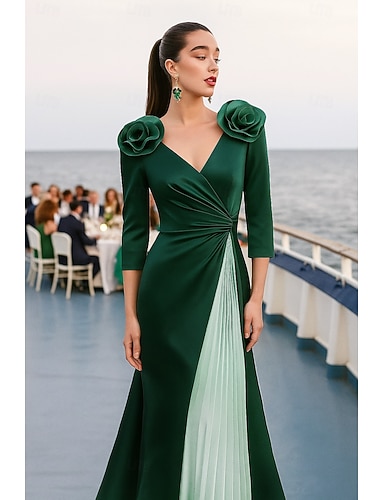 Tubino Colonna Lunghezza al pavimento Abito da ballo con mantello Abito da Sera Abito formale Elegante Monocolore Setoso Manica 3/4 Scollo a V Matrimonio Formale Mantelle Chiffon Raso con Fiore