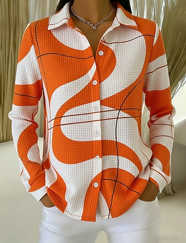 Camicia da Donna in Lino Leggera e Traspirante Camicia Tunica con Bottoni Collo Maniche Lunghe Grafica Geometrica Pois Vintage Quotidiana Elegante Per il Lavoro Stampa Blu Arancione Marrone Verde