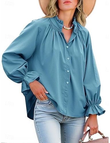 Per donna Camicia casual Camicia con Bottoni Blusa Volant Bottoni Tinta unica Elegante Vacanza Manica Lunga Collo alla coreana Top lunghi Quotidiano Spiaggia Ferie Blu Nero Bianco Rosso Cachi Estate