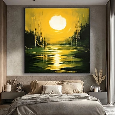 dipinto ad olio su tela astratta con texture verde smeraldo, tramonto dipinto a mano, lago verde, luna, riflesso sull'acqua, arte