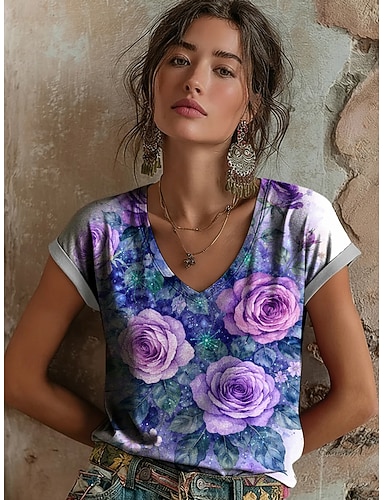 Maglietta Boho da donna con grafica floreale vintage elegante classica a manica corta collo a V top lunghi quotidiani abbigliamento per vacanze stampa blu viola fucsia verde estate primavera