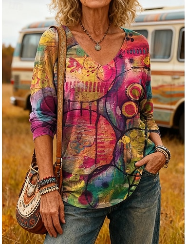 Per donna Maglietta Stampato Grafico Blocco di colori Vintage Casual Boho Manica Lunga Scollo a V Top Regolari Quotidiano Fucsia Primavera Autunno