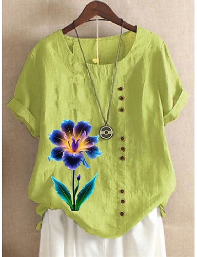 Camicia da donna in lino simile traspirante leggera camicia tunica con bottoni colletto maniche lunghe grafica floreale elegante casual top regolari quotidiani da uscita stampa verde chiaro verde