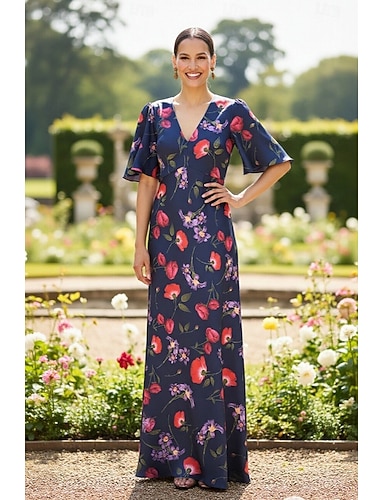 Linea ad A Lunghezza al pavimento Abito da invitata a nozze Abito Formale Abito da sera Abito da cerimonia per signora Mezza Manica Scollo a V Elegante Vintage Formale Ferie Raso con Stampa