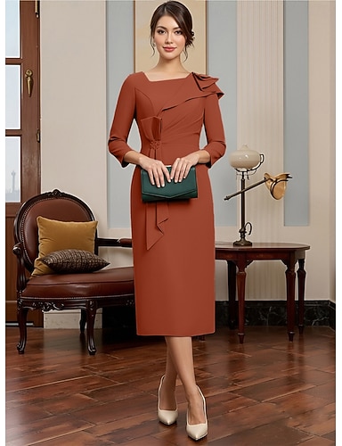 Tubino Colonna Lunghezza Tè Vestito da Festa Abito da Cocktail Abito da invitata a nozze Abito da cerimonia per signora Manica Lunga Collo quadrato Elegante Minimalista Formale Ospite di nozze