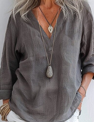 Per donna Camicia Blusa Finto cotone e lino Semplice Casual Manica Lunga Scollo a V Top Regolari Quotidiano Ferie Uscire Giallo Rosa Cachi Grigio Estate Primavera
