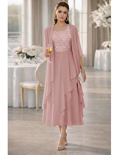 Due Pezzi Linea ad A Lunghezza Tè Abito da invitata a nozze Abito da cerimonia per signora Senza Maniche Manica 3/4 Scollo a Cuore Elegante Formale Ricevimento di matrimonio con Pizzo Fascia / Nastro