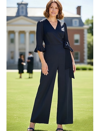 Tute Lunghezza al pavimento Tuta Abito da cerimonia per signora Senza Maniche Scollo a V Elegante Semplice Minimalista Formale Ospite di nozze Raso Tessuto Elasticizzato con Fascia / Nastro