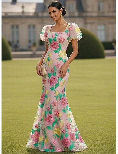 Sirena Tromba Lunghezza al pavimento Abito da Sera Vintage Floreale Manica Corta Scollo a V Festa serale Festa in giardino Organza Jacquard con Fiore ricamato
