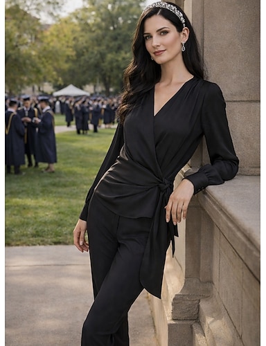 Due Pezzi Tuta Completo Pantalone Completo Pantalone Lunghezza alla caviglia Abito da cerimonia per signora Manica Lunga Scollo a V Elegante Vintage Semplice Formale Ospite di nozze Raso Tessuto