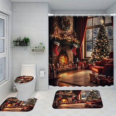 combinazione di tende da doccia in quattro pezzi, tra cui un sedile del water antiscivolo e un tappetino da bagno – motivo con camino natalizio, albero di Natale, pupazzo di neve, materiale in