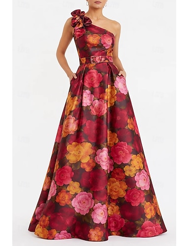 Linea ad A Lunghezza al pavimento Abito da Sera Abito formale Elegante Floreale Setoso Manica Corta Girocollo Festa in giardino Matrimonio Tasca Raso con Stampa floreale Fiocco/Fiocchi Con Spalline