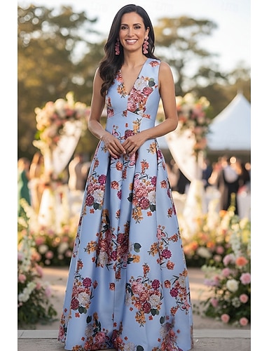 Linea ad A Lunghezza alla caviglia Abiti da Cocktail Abito svasato Elegante Abiti semi formali Senza Maniche Collo Alto Festa in giardino Matrimonio Raso con Stampa floreale