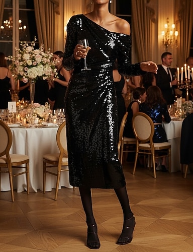 Tubino Colonna Lunghezza Tè Abiti da Cocktail Abiti da festa Elegante Manica Lunga Monospalla Festa in giardino Matrimonio Con Paillettes con Pieghe