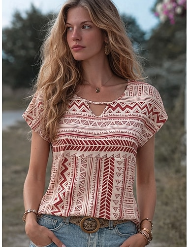 Per donna Maglietta Stampato Geometrico Blocco di colori Bohemien Vintage Casual Manica Corta Scollo a V Top lunghi Quotidiano Weekend Nero Bianco Rosso Blu marino Estate Primavera