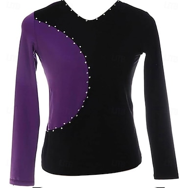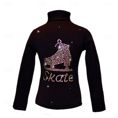 top da pattinaggio artistico nero elastico da allenamento, da competizione, termico, caldo, con cristalli/strass, manica lunga, pattinaggio artistico sul ghiaccio