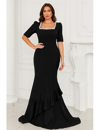 Sirena Tromba Lunghezza al pavimento Abito da Sera Elegante Plissé a strati Mezza Manica Collo quadrato Matrimonio Formale Crepe Elasticizzato Shiena scoperta con Volant