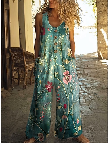 Per donna Tuta Attivo Floreale Senza Maniche Senza maniche Gamba larga Collo a U Tasca Bottoni Quotidiano Vacanza Vestibilità comoda Verde Estate