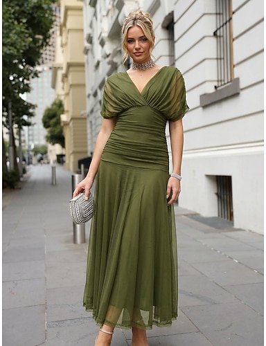 Linea ad A Lunghezza alla caviglia Abito Formale Abiti da Cocktail Elegante Manica Corta Scollo a V Matrimonio Formale Tulle Tessuto Elasticizzato con Arricciato