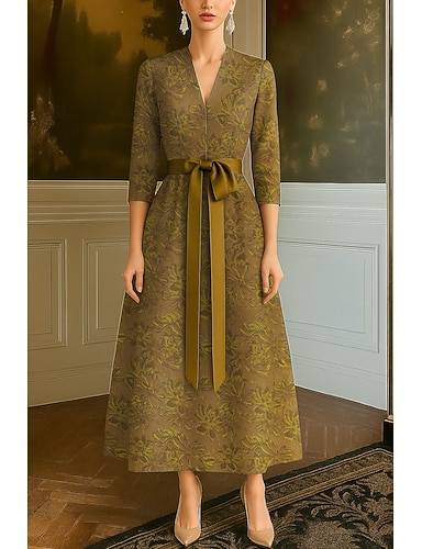 Linea ad A Lunghezza Tè Vestito da Festa Abito da Cocktail Abito da invitata a nozze Abito da cerimonia per signora Manica 3/4 Scollo a V Elegante Formale Ospite di nozze Ricevimento di matrimonio