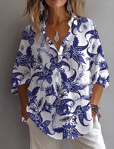Per donna Camicia Finto cotone e lino Bottoni Stampato Floreale Grafico Bohemien Attivo Casual Manica Lunga Colletto a Camicia Top Regolari Quotidiano Ferie Verde Estate Primavera Autunno