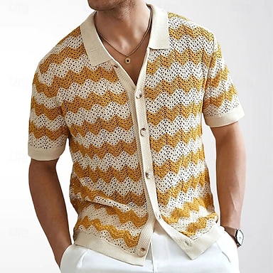 Per uomo Geometrico A righe Camicia Camicia con Bottoni Manica Corta Moda Casual Vacanza Casuale Ferie Estate Primavera Collo ripiegato camicie con colletto Nero