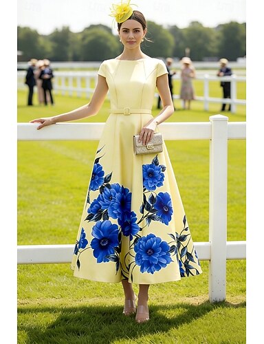 Linea ad A Lunghezza Tè Abiti da Cocktail Elegante Floreale Manica Corta Scollo a Barca Festa in giardino Matrimonio Tasca Raso con Stampa floreale
