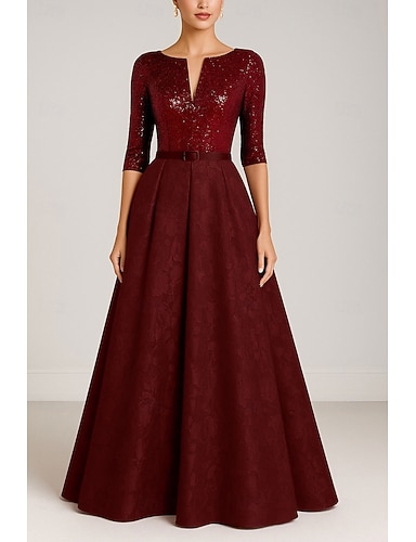 Abito Lunghezza Piena Abito da Sposa per Invitate Abiti Formali Abito da Sera Abito Madre della Sposa Manica 3/4 Girocollo Elegante Semplice Invitate di Matrimonio con Pizzo Colore Solido