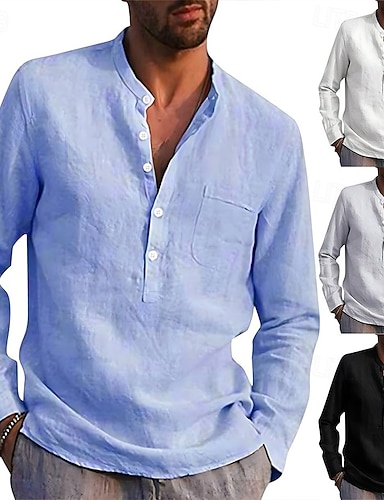 Per uomo Camicia camicia di lino Camicia con colletto a fascia Camicia estiva Abbigliamento mare Tinta unica Strada Hawaiano Blu chiaro Rosso bordeaux Nero Bianco Manica lunga Colletto Estate