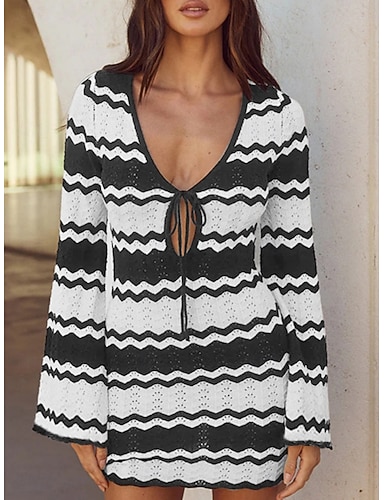 Vestito da bagno coprente da donna Maglina Vacanza Mare Abbigliamento Color Block Stripes Collo a V Maniche Lunghe