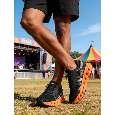 Sneakers da uomo nere e arancioni, robuste, traspiranti, con lacci, scarpe sportive casual ideali per festival musicali, concerti, street style, feste all'aperto, outfit alla moda e look sportivi di tendenza.