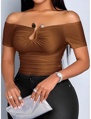 Per donna Blusa Arricciato Patchwork Semplice Elegante Sexy Manica Corta Senza Spalle Top corti Quotidiano Ferie Uscire Nero Marrone Estate Primavera