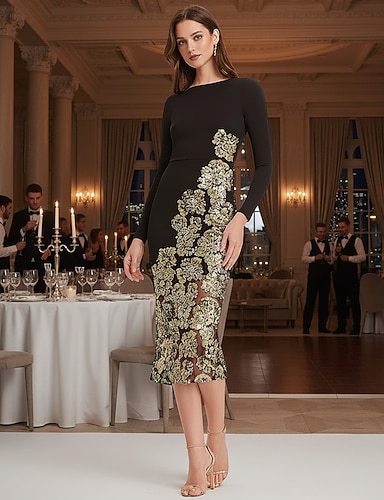 Tubino Colonna Lunghezza al ginocchio Vestito da Festa Abito da Cocktail Abito da invitata a nozze Abito da cerimonia per signora Manica Lunga Collo gioiello Elegante Vintage Lussuoso Ospite di nozze