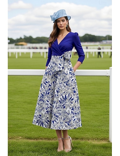 Linea ad A Lunghezza al pavimento Abito da invitata a nozze Abito Formale Abito Derby Abito da cerimonia per signora Manica 3/4 Scollo a V Colletto a Camicia Elegante Formale Ferie Derby del Kentucky
