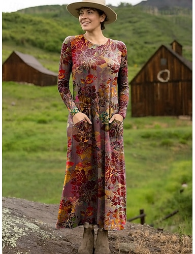 Per donna Abito maxi Tubino Vestito T-Shirt Vacanza Casual Quotidiano Uscire Vestibilità comoda Floreale Grafico Manica Lunga Girocollo Blu Rosso Viola Verde Primavera Autunno Inverno