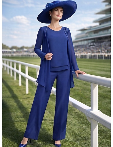 Tuta Completo Pantalone Tre Pezzi Lunghezza al pavimento Abito da cerimonia per signora Manica Lunga Girocollo Elegante Ospite di nozze Festa di fidanzamento Chiffon con Perline