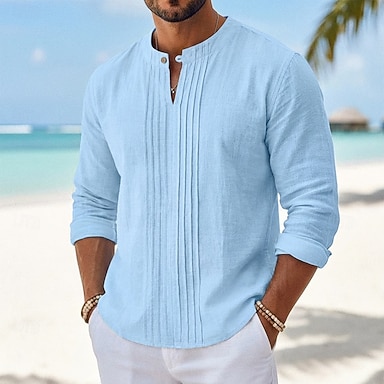 Per uomo Camicia Camicia di lino Camicia Estiva Camicia da Spiaggia Tinta unica Casuale Vacanza Blu Nero Bianco Cachi Manica Lunga Collo alla coreana Estate Abbigliamento Arricciato