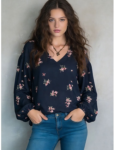 camicetta da donna blu navy folk magiara manica lunga scollo a V orlo irregolare casual quotidiano stagioni incrociate